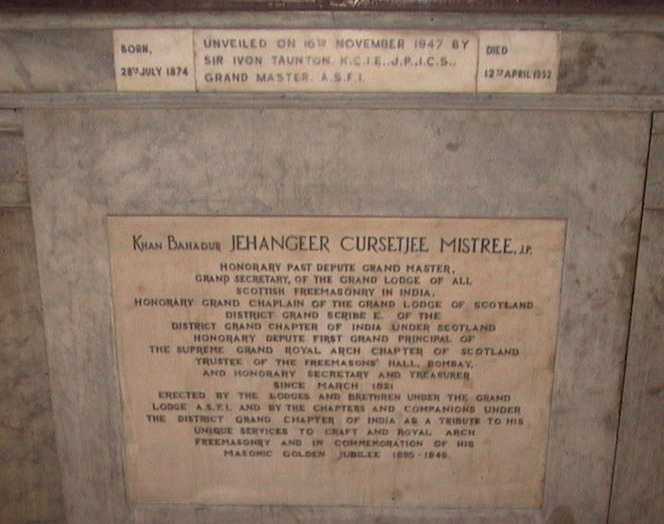 Cama (whose marble plaque is in the Freemasons' Hall at Mumbai as shown alongside) in 1886 was given the rank of Treasurer in the Grand Lodge of